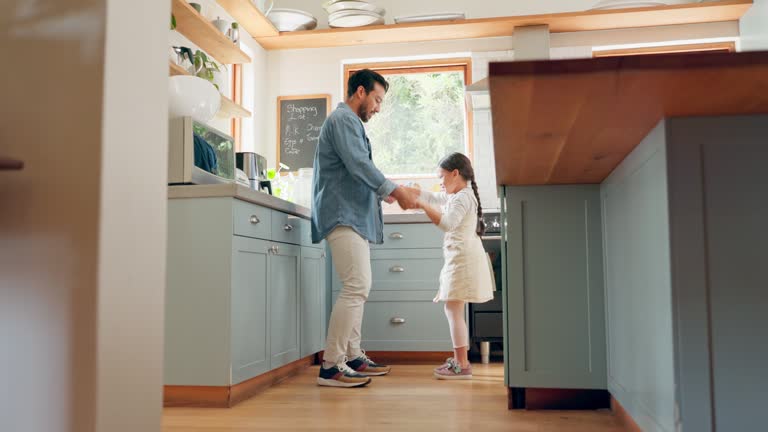 Ballet, girl and father dance together in a kitchen with love and support for excited dancer and ballerina daughter. Tutu, dad and man dancing with child and bonding with kid in house or home